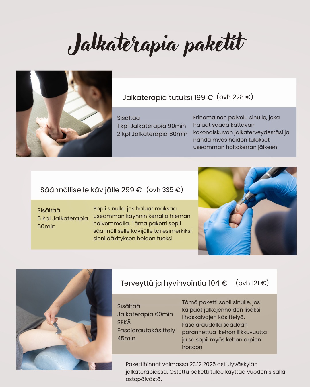 Jalkaterapia paketit, jotka tukevat terveyttä ja hyvinvointia sekä helpottavat arkea - monipuolista jalkaterapiaa eri tarpeisiin!