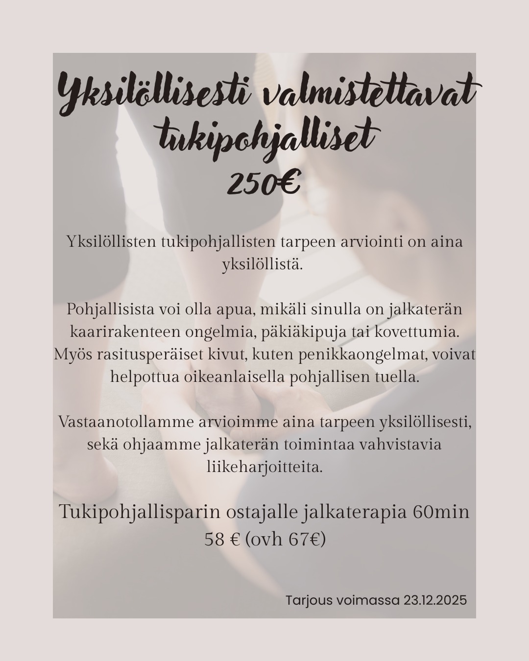 Tukipohjallisparin ostajalle yksilöllinen jalkaterapia 60min 58€ (ovh 67€)